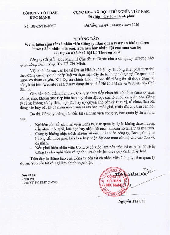 Thông báo V/v nghiêm cấm tất cả nhân viên Công ty, Ban quản lý dự án không được hướng dẫn nhận môi giới, hứa hẹn hay nhận đặt cọc mua căn hộ tại Dự án nhà ở xã hội Lý Thường Kiệt